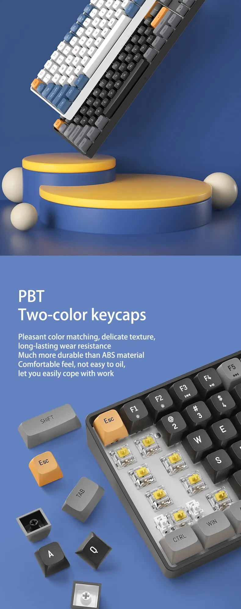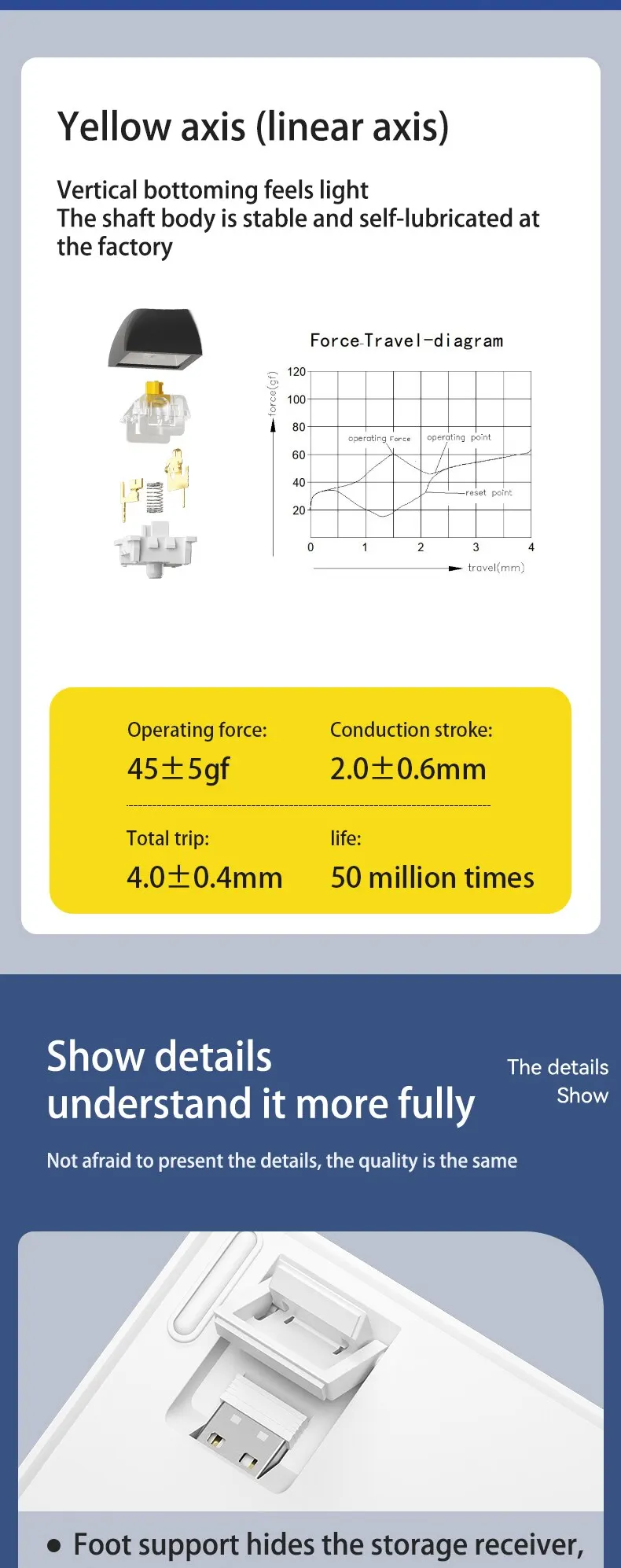 The blue switch/ Yellow switch is the most characteristic switch of the mechanical keyboard. Whether it is the sound or the feel, it can let you find a special pleasure. The double-layer 4-time paragraph feeling, the feedback of the key is self-evident, no matter the code word Whether it is a game or a game, it can emit that crisp sound and rhythm, which is endless aftertaste. 50 million keystroke life makes you worry-free!