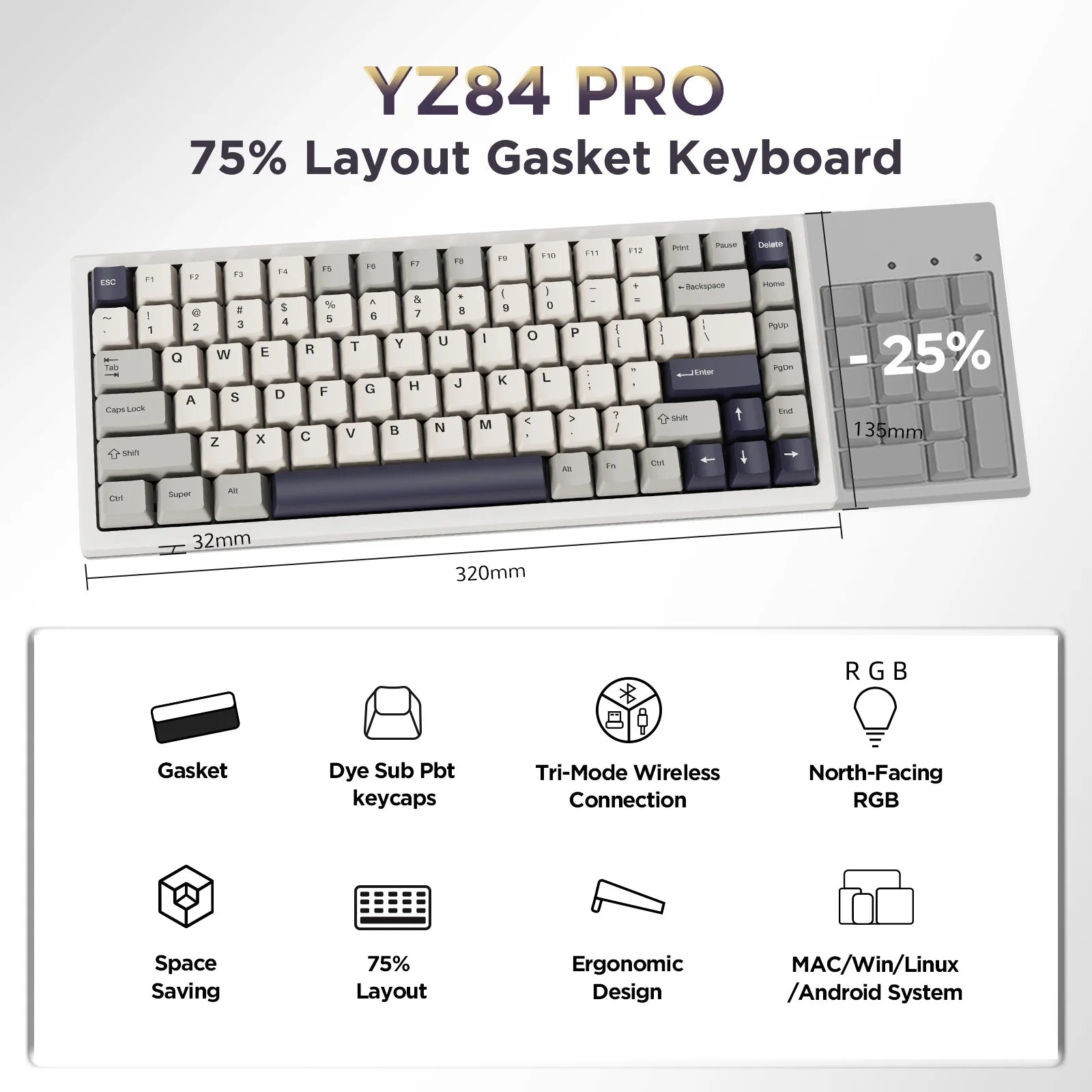 Compared to the KC84 version, the YZ84 PRO is upgraded with gasket mount and wireless connection. The 75% TKL mechanical gaming keyboard takes Gateron G Pro switch and pre lubed stabilizers. Build in double layers sound absorbing foams give the keyboard premium typing experience. The wireless keyboard is a 75% mechanical keyboard that is fully customizable, geared for mechanical keyboard enthusiasts and beginners.
