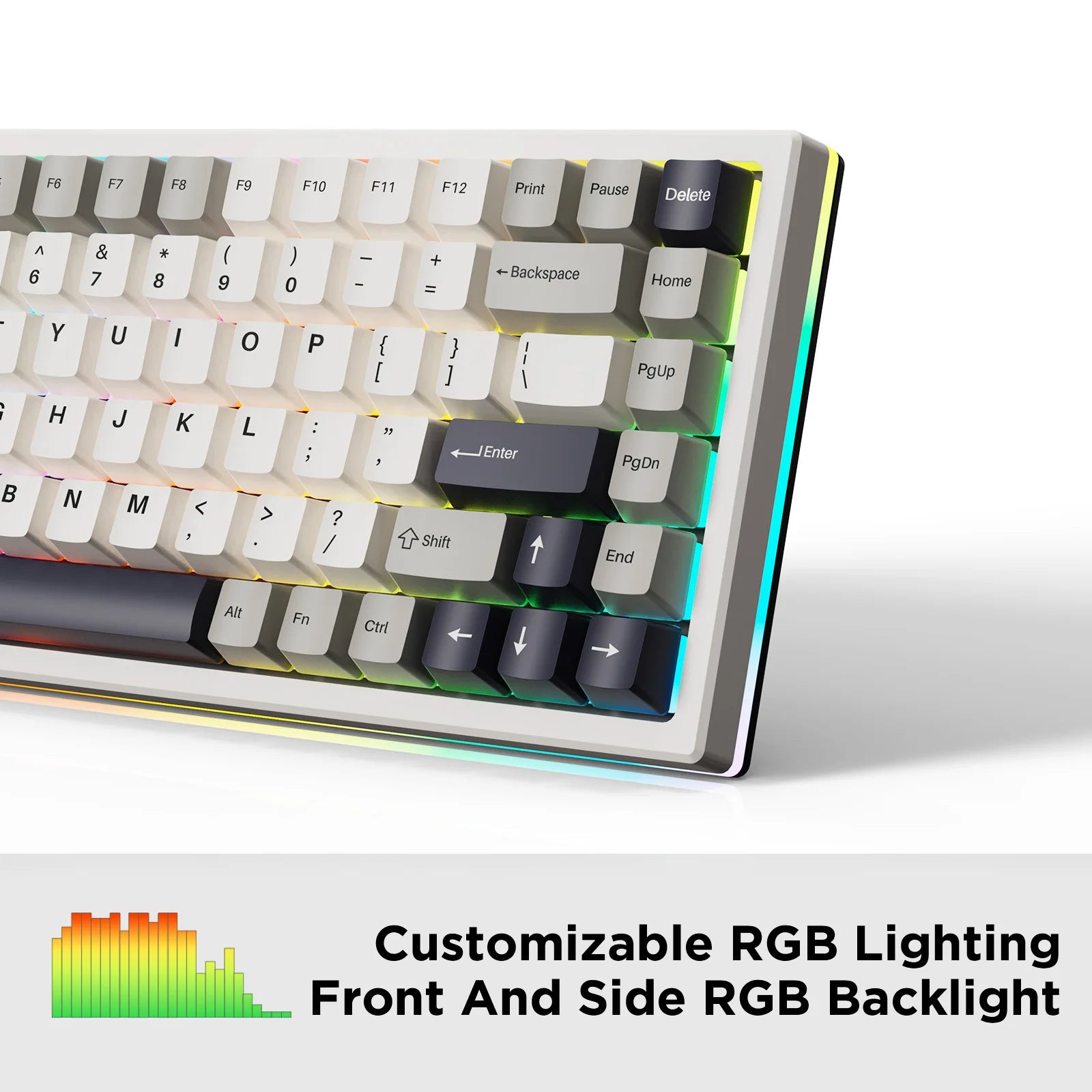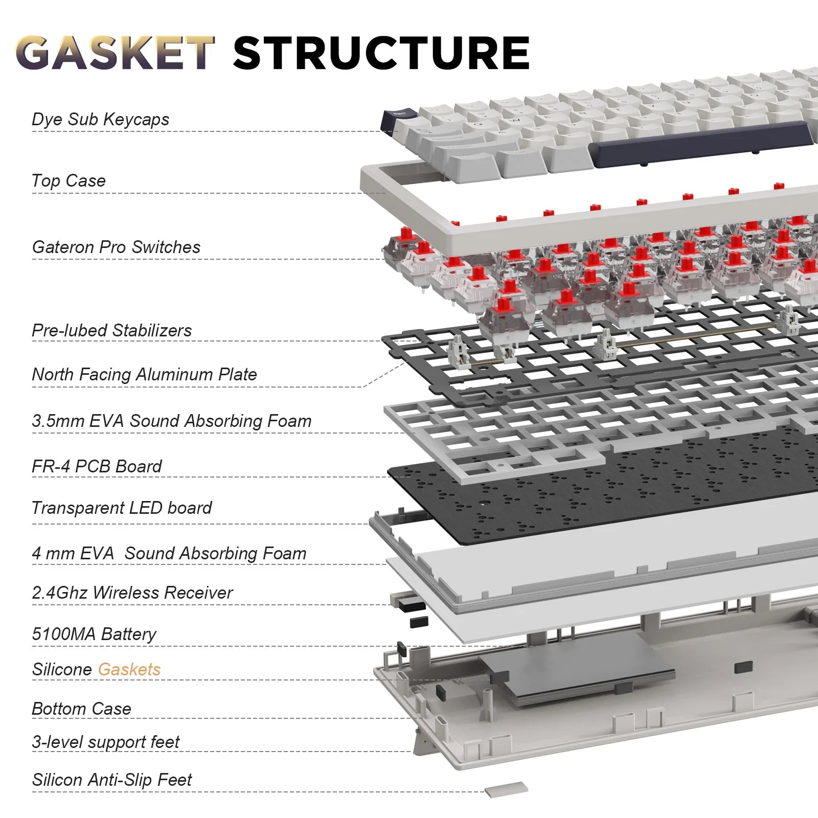 As a as a gasket-mounted mechanical keyboard, this 75% Layout tkl mechanical keyboard uses a gasket on the keyboard plate's top and bottom edges without being in direct contact with the case, that reduces the occurrence of vibrations within your keyboard case, creating a level of stability that enhances the purity of every keystroke and offering a very satisfying typing experience as much quieter, softer and cushioned.