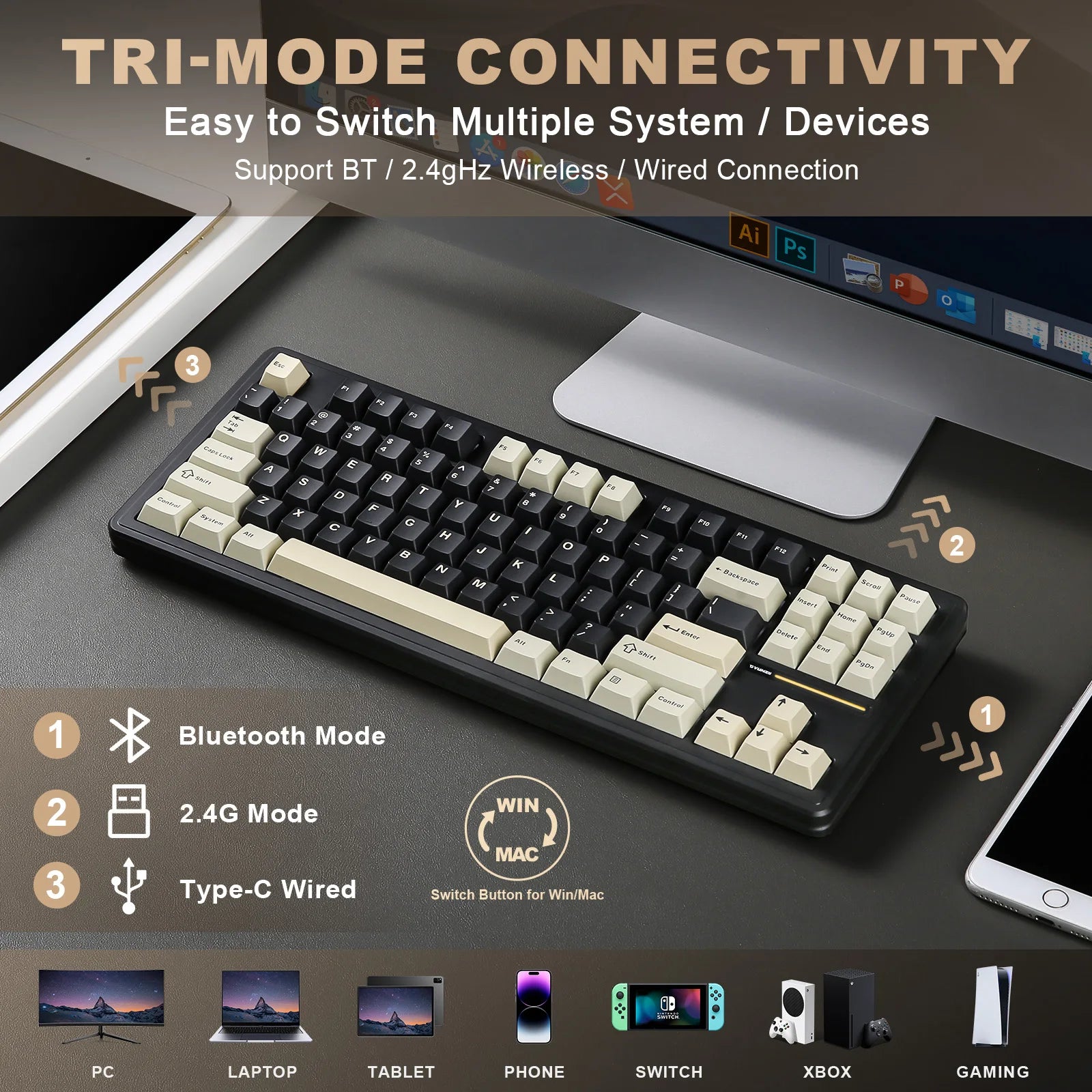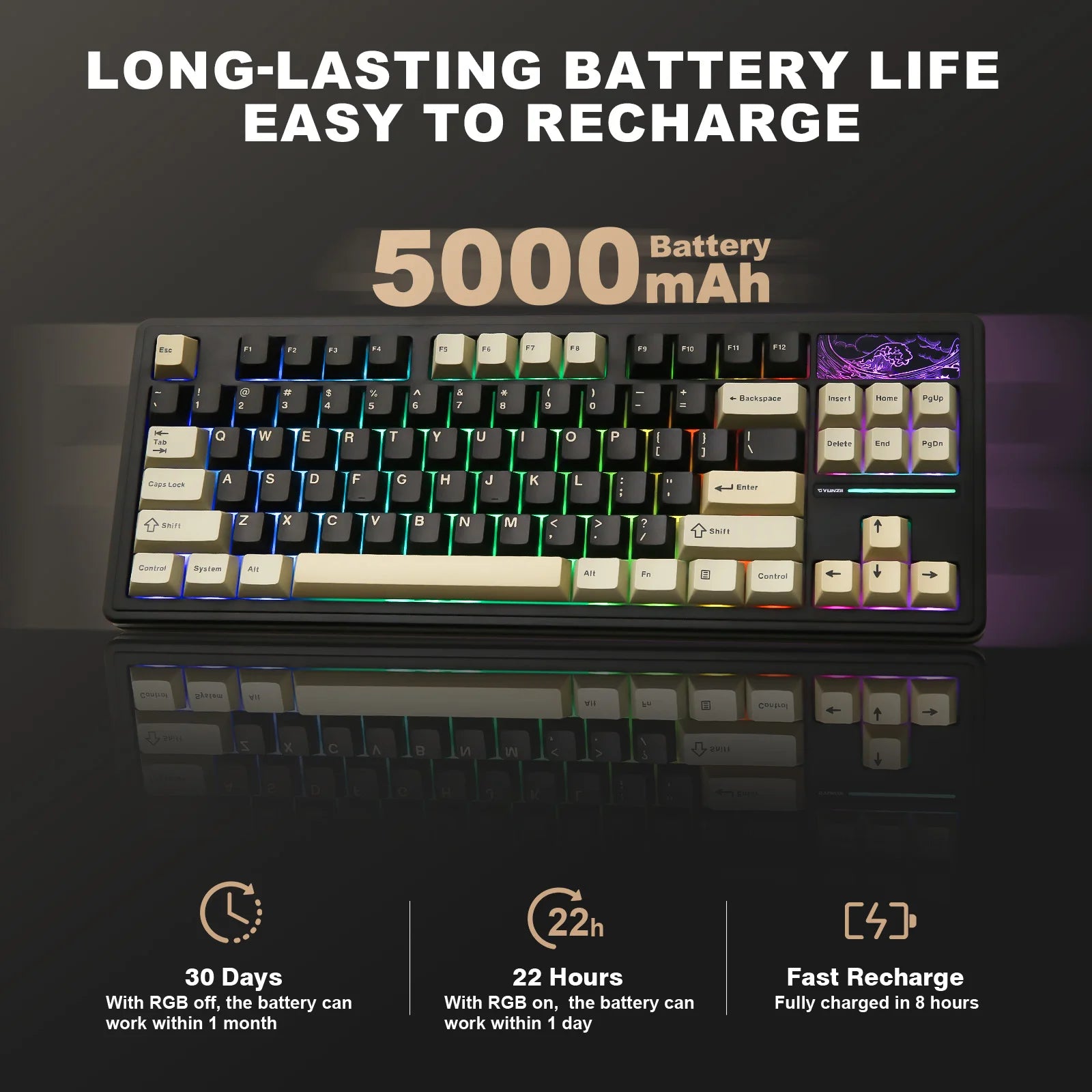 Built-in large-capacity 5000mAh battery, the rechargeable keyboard is durable for successive work or intense gaming. With Bluetooth, 2.4GHz, and Type-C connections, the wireless keyboard can connect devices such as laptops, tablets, PC, Phones, and several systems, IOS, Windows, Mac, and Android, Linux. YZ87 ensures a seamless and stable connection switching between three devices. In all, this keyboard is ready for any situation.