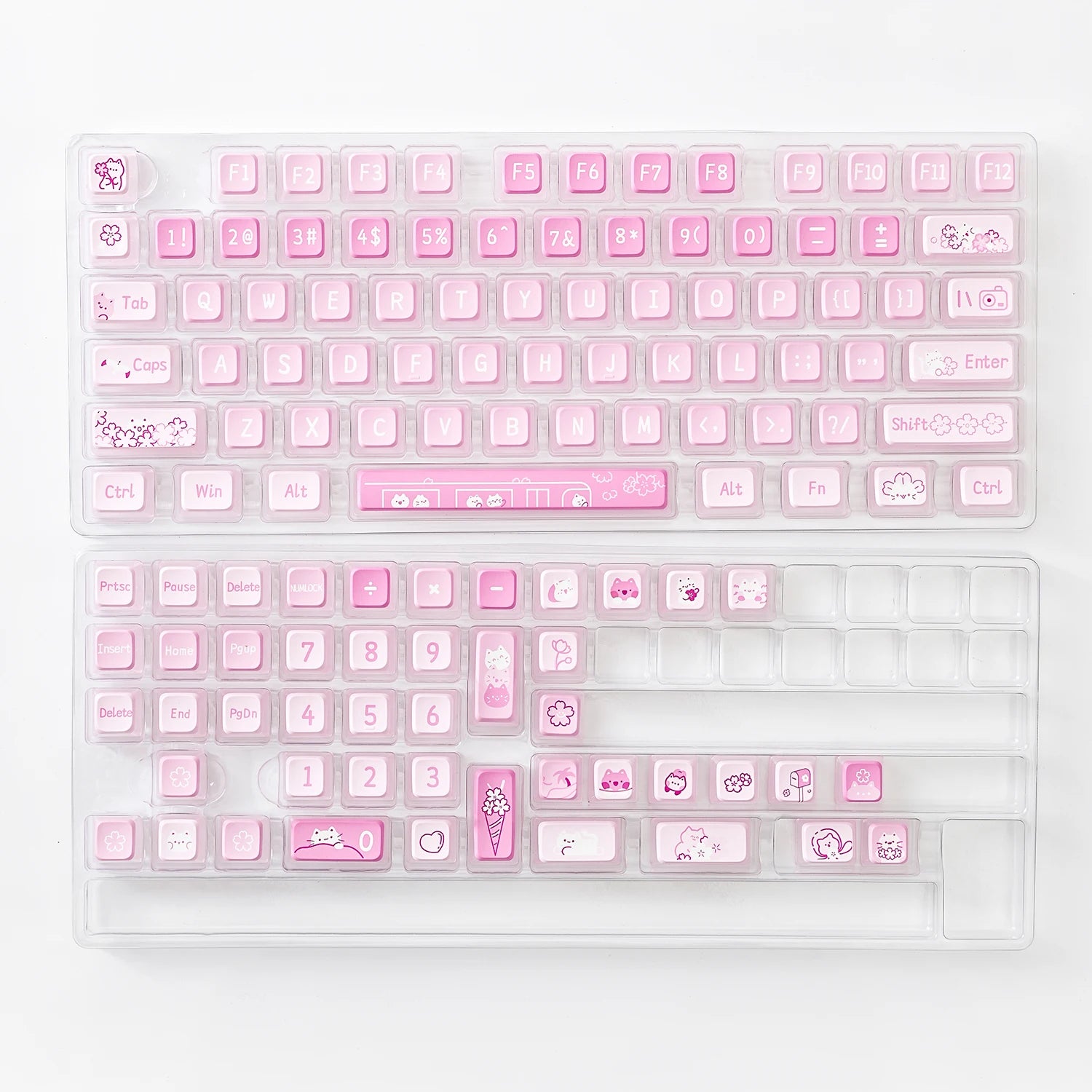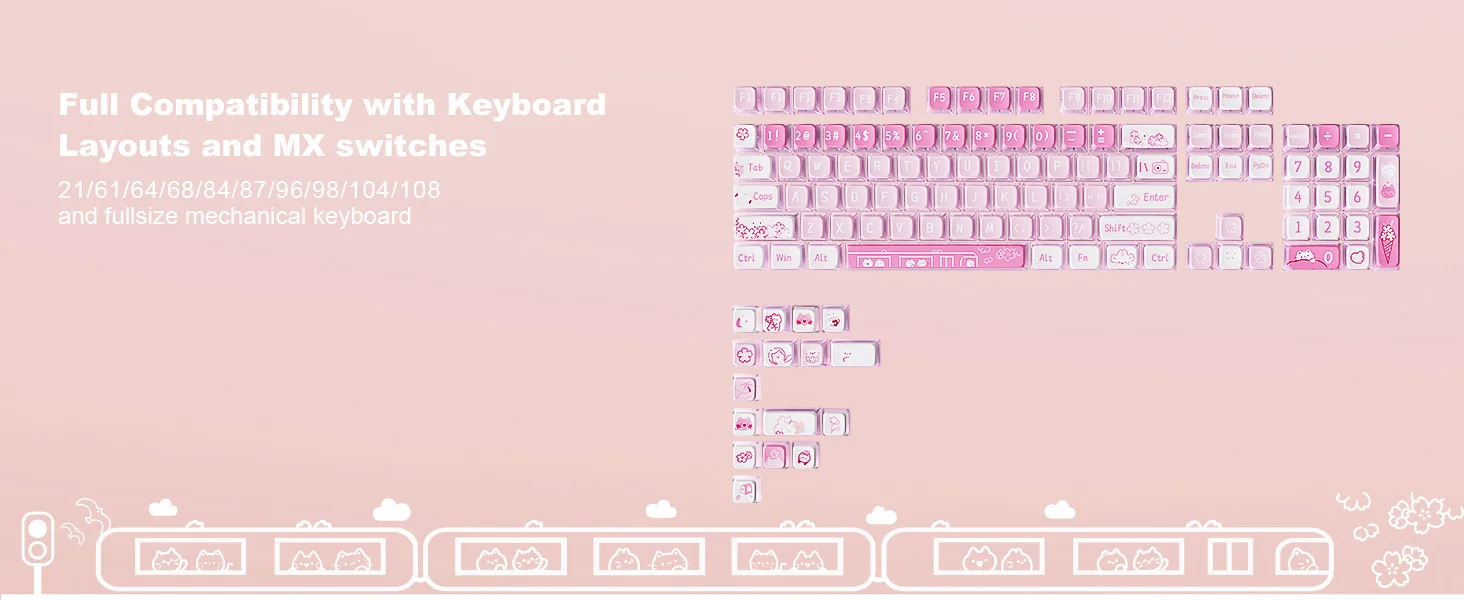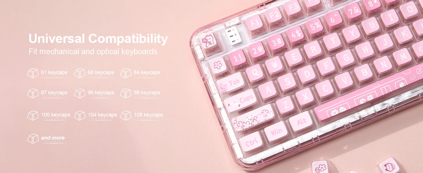 This keycap set has more than 120 keycaps and will fit any size keyboard, like 61/87/104/108/84/64/98/96 and fullsize mechanical keyboards. Get one set and make it all work. It is a good choice for you to custom keyboard.