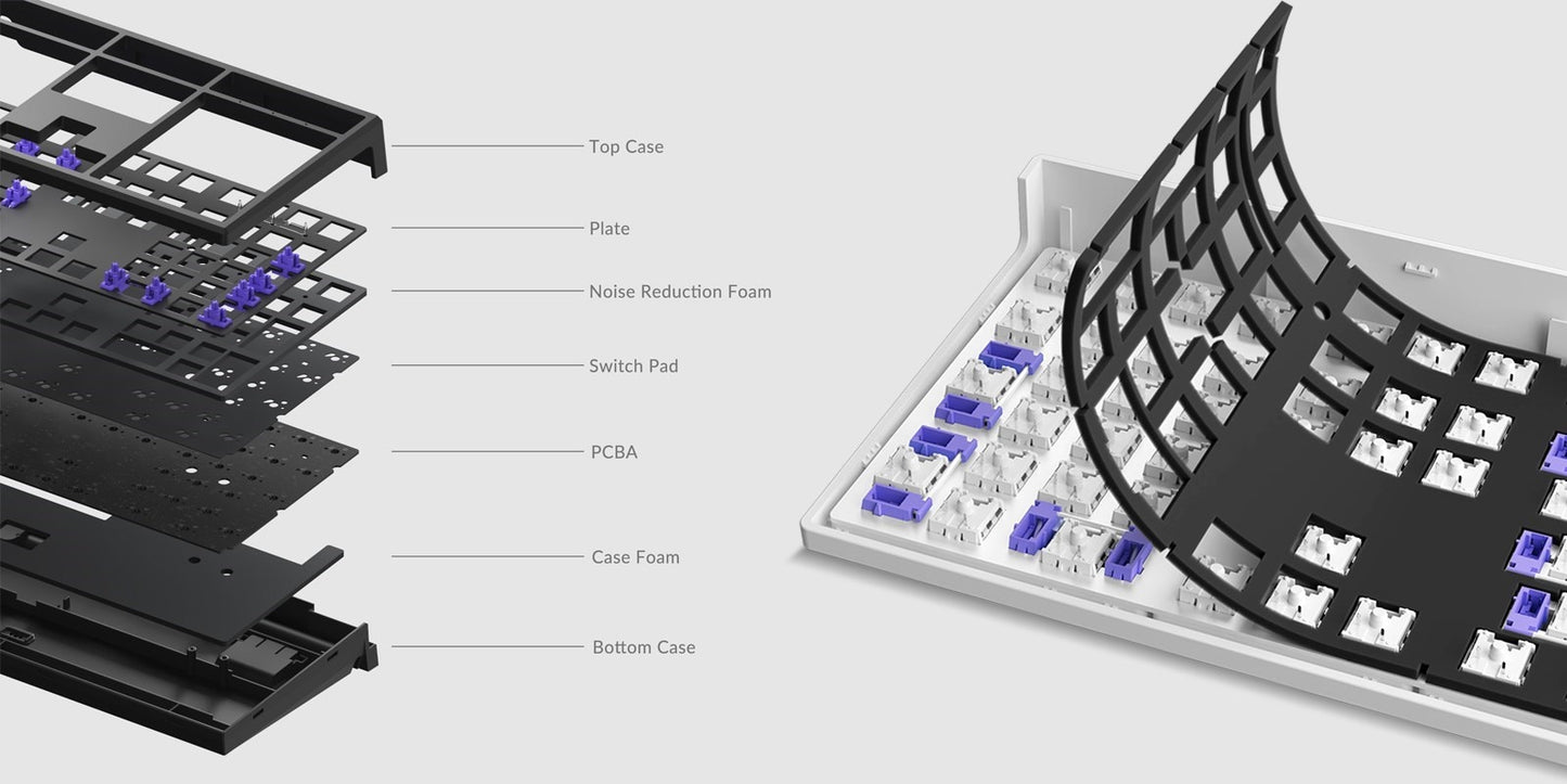With hot-swappable sockets, the Monsgeek MG108Wkeyboard allows you to easily complete your Keyboard. The kit supports both 3-pin and 5-pin switches, making it compatible with most mechanical switches in the market. No need for any kind of soldering, simply connect or replace your switches on the MG108W Kit.