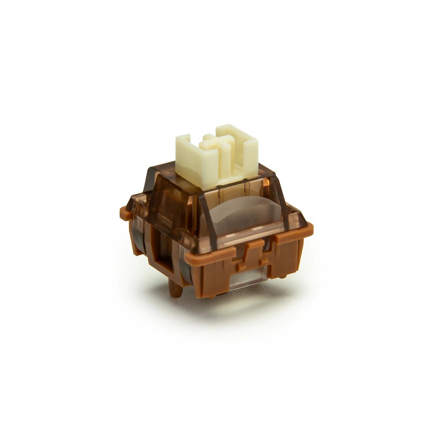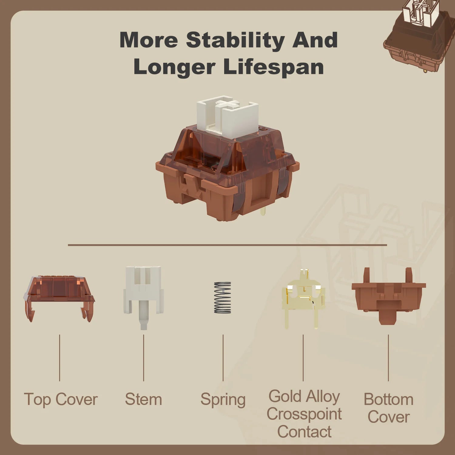 The YUNZII cocoa cream switch is crafted with high-quality transparent brown PC upper housing, Nylon coffee brown base housing, and POM long stem, YUNZII cocoa cream switches add new antioxidant gold contacts to increase the keyboard switch's lifespan, guaranteeing the switch operation life up to 50M cycles.