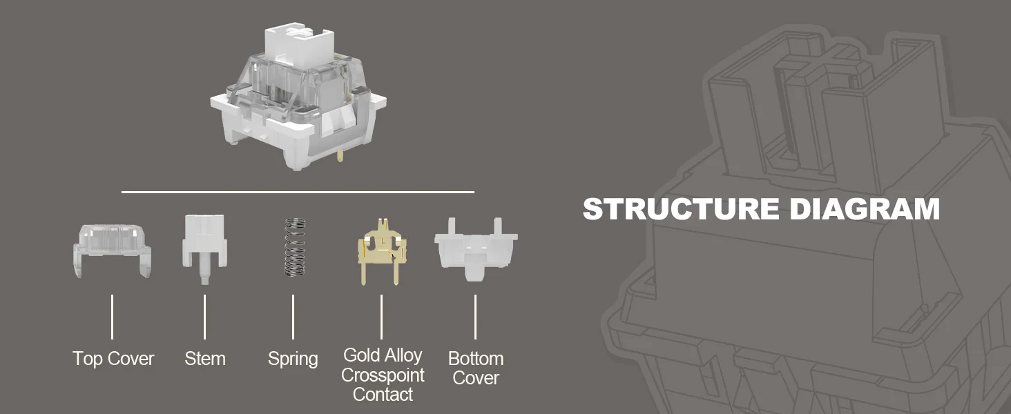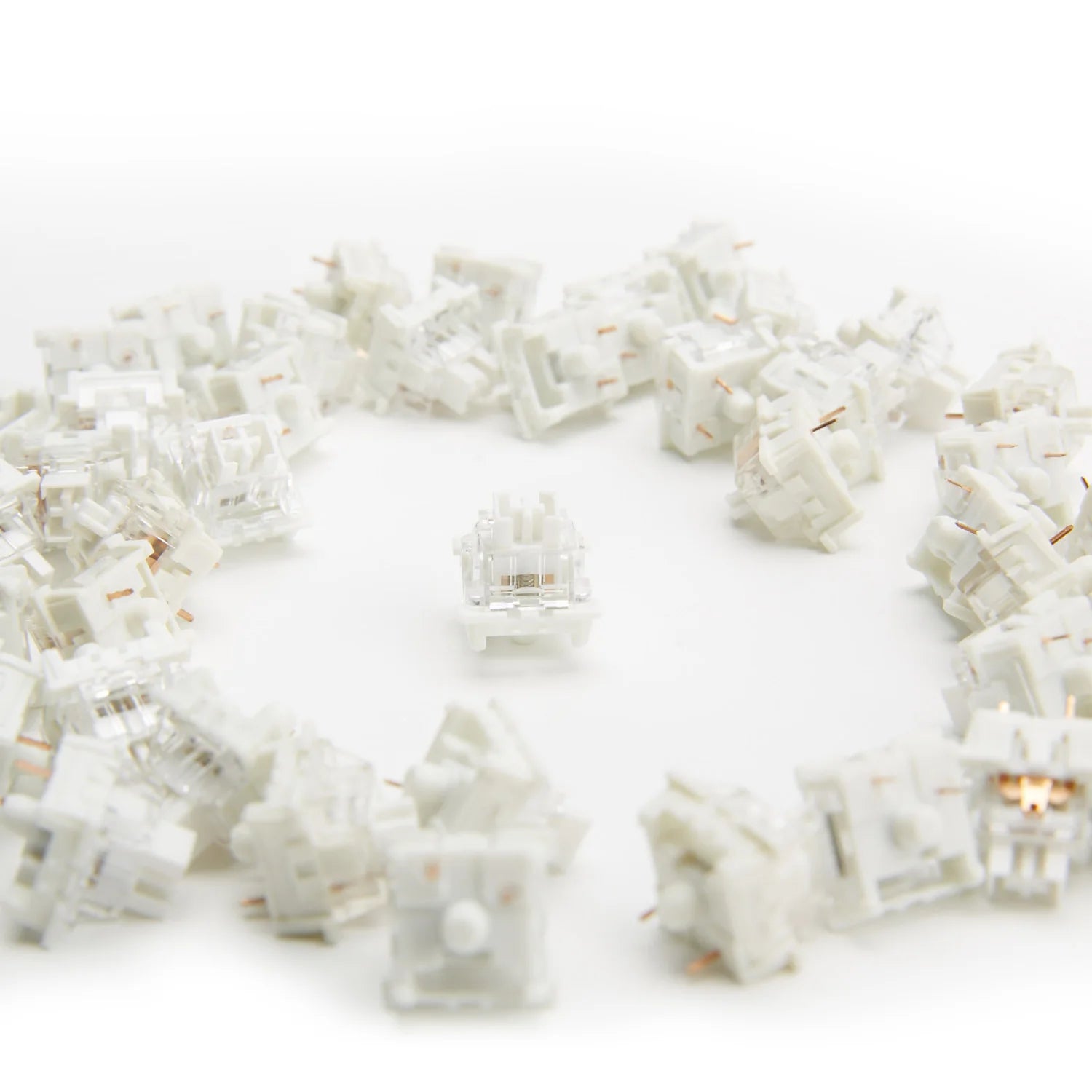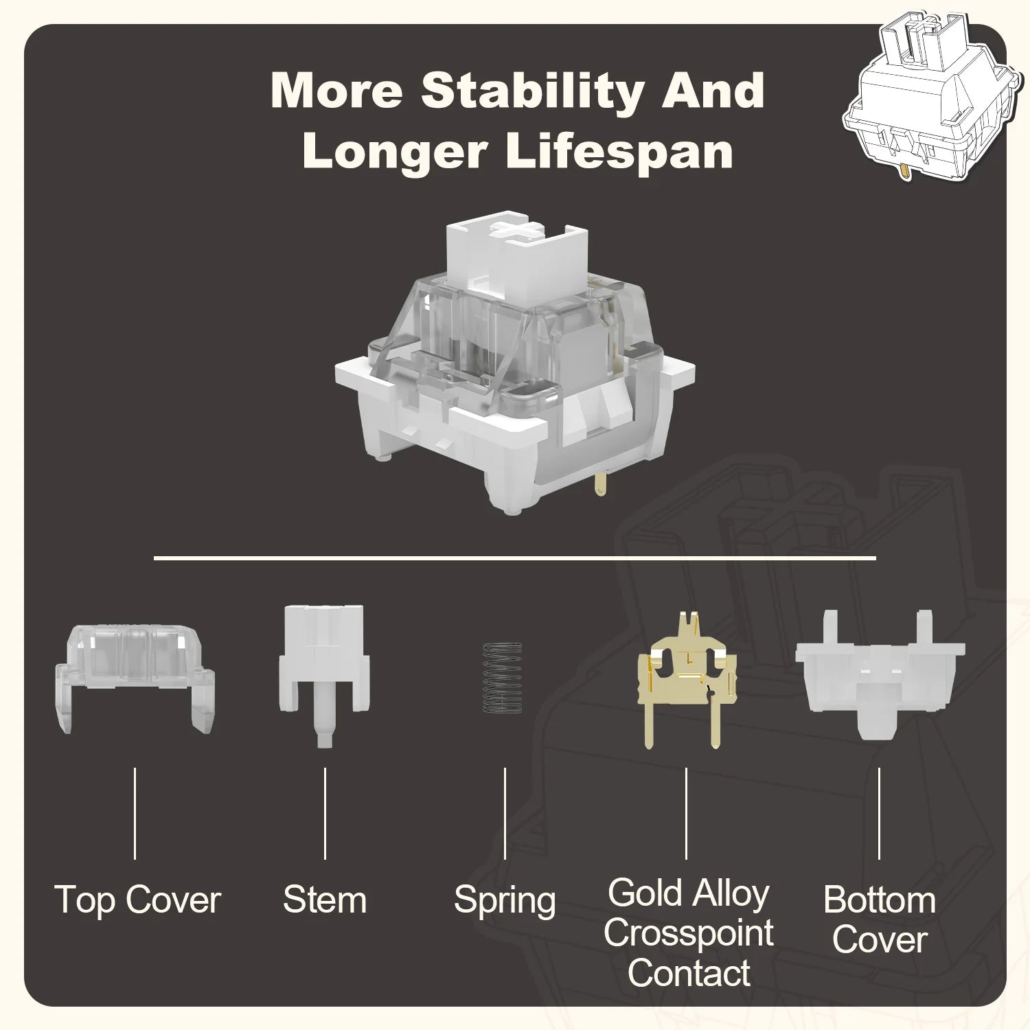 The YUNZII milk switch is crafted with high-quality transparent PC upper housing, Nylon milky white base housing, and POM stem, the milk switches add new antioxidant gold contacts to increase the keyboard switch's lifespan, guaranteeing the switch operation life of up to 50M cycles.