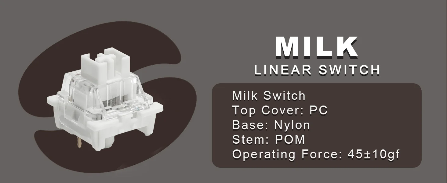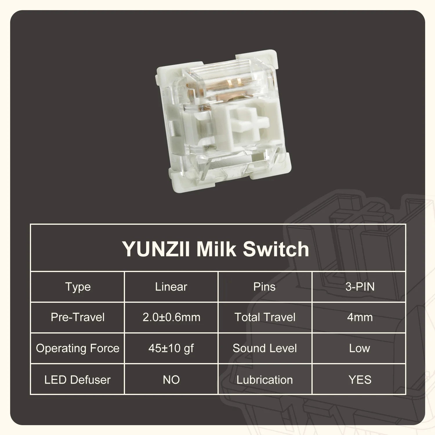 YUNZII milk switch is a kind of linear switch, which is an operating force of 45±10 gf, pre-travel 2.0±0.6mm, and total travel of 4.0 mm Max., the milk switch features a low sound level, its finger strike feeling is vertical, light pressing force, soft rebound, suitable for gaming and office.