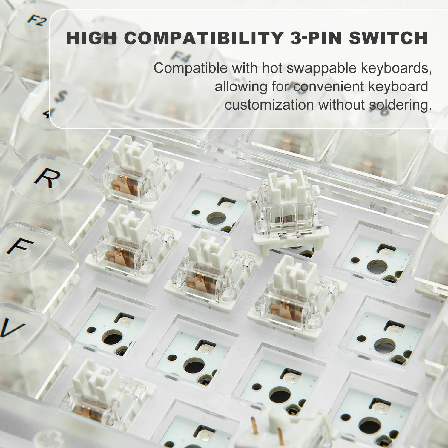 This milk 3-Pin switch combines a hollowed-out light position design with a transparent upper housing to provide compatibility for SMD-LED and RGB-LED light.