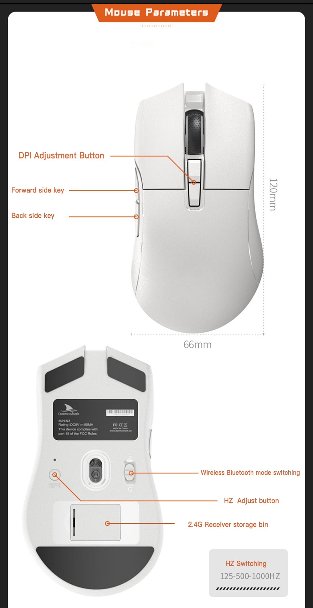 When the bottom three section switch is turned to the B icon, press the left, middle and right buttons at the same time, and the blue light of the scroll wheel position flashes, entering the pairing state. At this time, you need to turn on the Bluetooth device to search for the N3 Mouse before pairing. After the connection is successful, the indicator light goes out.